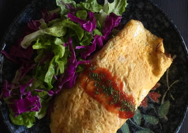 - Buat telur dadar tipis, lalu bentangkan di atas piring dan isi atasnya dengan nasi goreng lalu gulung..